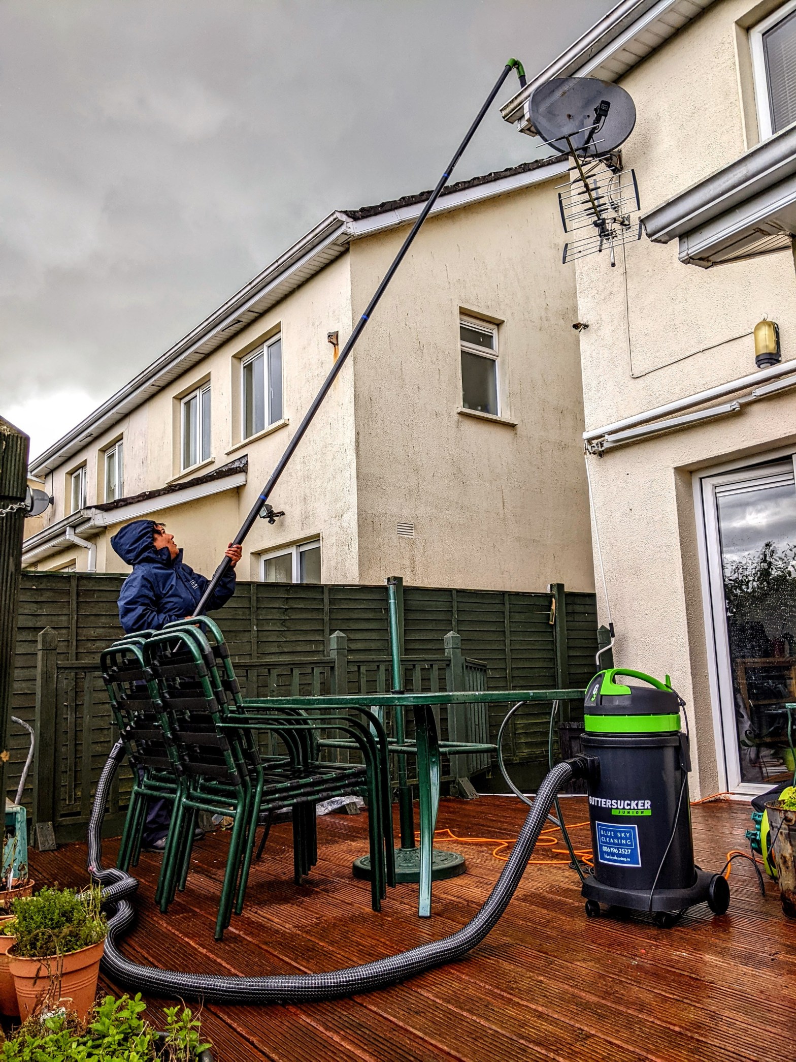 At Blue Sky cleaning we do our best not to work at height as much as possible. The safest way is by keeping our feet firmly on the ground. Just like our water fed pole system, we use a machine called a gutter sucker which we can use from ground level. The benefit is that no heavy ladders need to be placed on your gutter, with an overflowing bucket of mud and moss precariously positioned at the top. Or ladders having to be carried around your property, thus reducing any potential damage to your residence, and to ourselves. The vacuum on our machine is powerful enough to clean all debris, leaves and stagnant water from your gutters. After all the insides have been cleaned we then, with our pole system, give your fascia and soffits a good clean. Once dried they look as good as new!